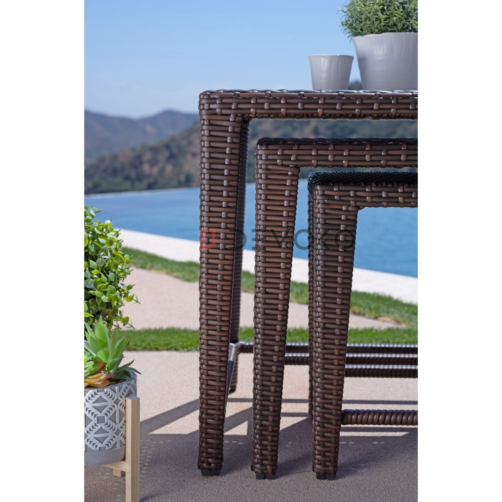 This wicker table is versatile and durable. It’s been a great addition to our outdoor entertainment area.