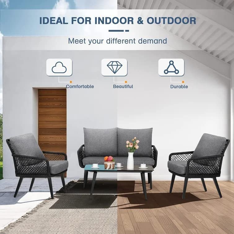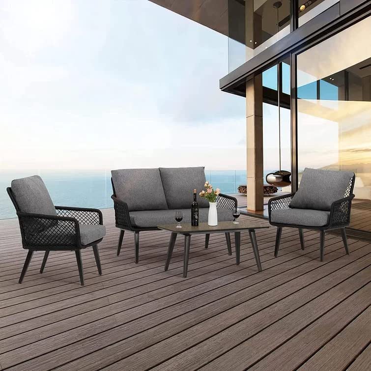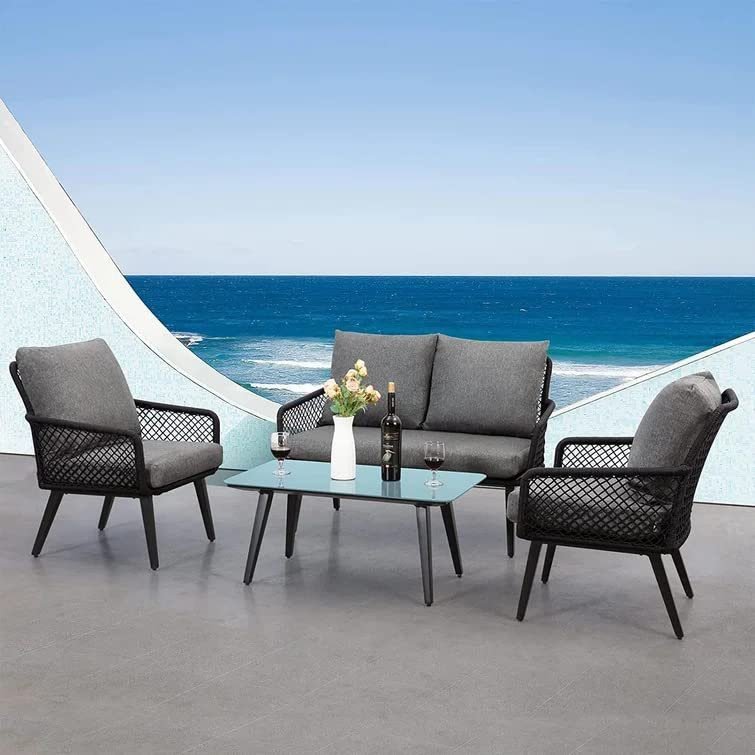 Introducing the DEVOKO Outdoor and Indoor 4 Seater Chair Set with Center Table and Cushioned Chairs – the perfect addition to your garden or balcony. Built with a powder-coated iron frame, this sofa set is both sturdy and durable, with a seat capacity of up to 120 kg per seat. The elegant and sophisticated rope furniture in a black and grey color combination elevates the aesthetic appeal of your home. Upgrade your outdoor relaxation with this DEVOKO sofa Set designed with a powder-coated iron frame and strong woven rope frame for a trendy style that looks contemporary in any setting. Use it anywhere including the Balcony, Garden, Deck, Backyard for a functional, comfortable style. The armrest is designed according to ergonomic design so as to reduce muscle strain. And the glass top is very easy to clean. This small patio furniture set has a contemporary appeal, which fits a variety of living space styles and settings. Comes with a round café table, you can still enjoy a cup of coffee under the sun even if you only have a limited patio space.
