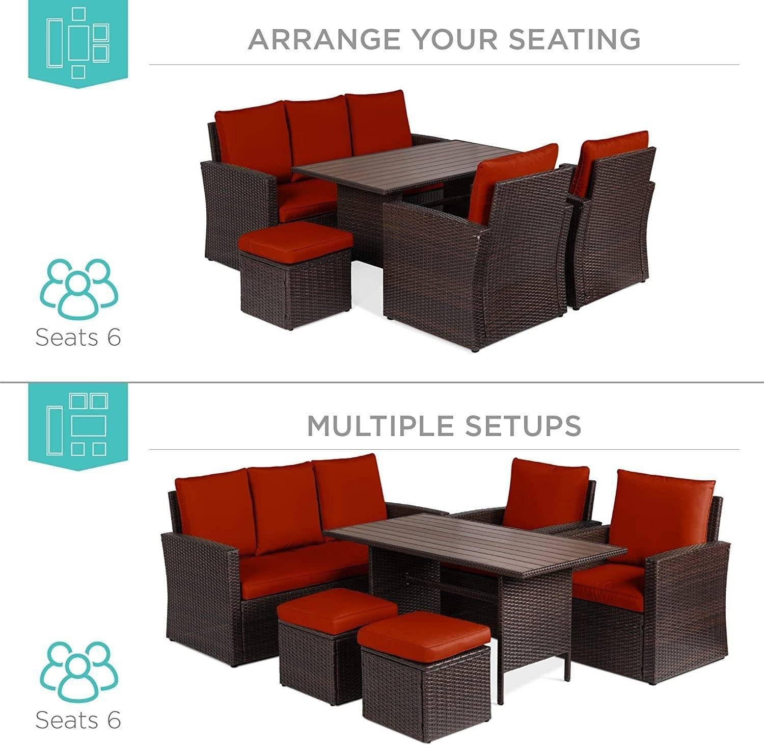 This wicker patio sectional furniture sets with dining table is best choice for your outdoor leisure time with your family or friends Adopting high quality weather-resistant HDPE rattan and iron frame, it features stable, sturdy and durable. With soft cushions, it also can ensure comfortable seating experience. So what are you waiting for? Don’t hesitate, it’s worth buying! Modern and Versatile This modern patio sectional sofa furniture set can adorn your deck, patio, backyard, and pools, perfect for you and your family to enjoy a leisure time. Selected Materials This outdoor sectional furniture is constructed of rust-resistant powder coated iron frame and all-weather UV-resistant HDPE rattan to ensure a long service time and provide an excellent support base. Comfortable Cushion Filled with high density thick sponge for ultra comfort. Breathable waterproof cushion cover is removable and washable. Flexible Combination Design Each part of the patio furniture set could be used separately, just combine it into different configurations based on your preference. Elegant Dining Table This patio set also comes with a gorgeous glass top dining table that perfectly highlights your patio or indoor décor.