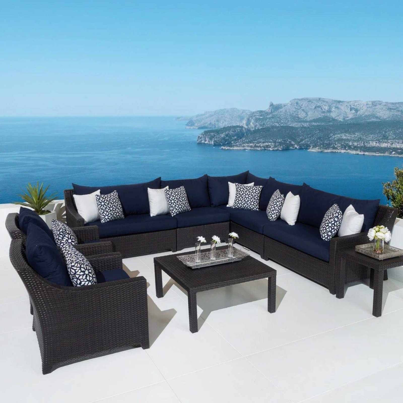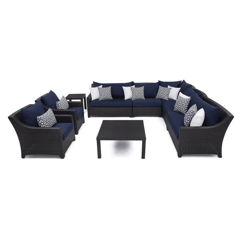 Outdoor Wicker 9 Seater Sectional Sofa Set with Side and Center Table (Dark Brown & Navy Blue)